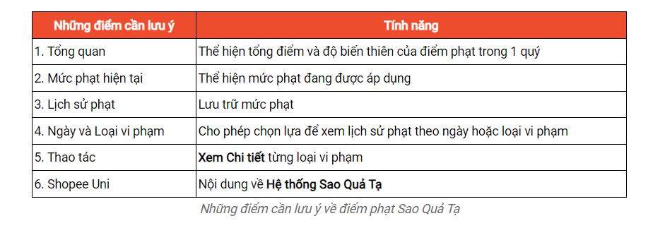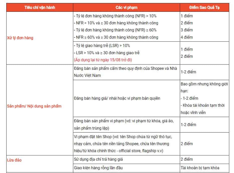 Gian hàng sẽ bị tính điểm Sao Quả Tạ khi vi phạm các tiêu chí kinh doanh, vận hành do hệ thống Shopee đã đặt ra. Cụ thể, Cách tính sao quả tạ tại Shopee được trình bày dưới dạng bảng trong hình như sau: