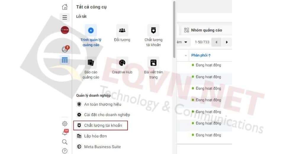 Bước 1: Truy cập vào Trình quản lý quảng cáo, bấm vào biểu tượng 3 gạch ở góc bên trái, rồi chọn “Chất lượng tài khoản”.