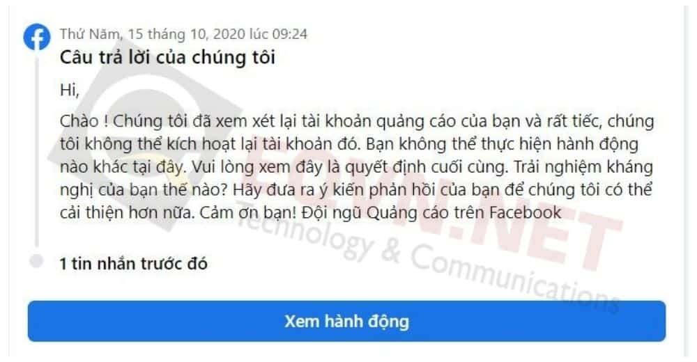 Trường hợp 2: Tài khoản quảng cáo kháng nghị không thành công