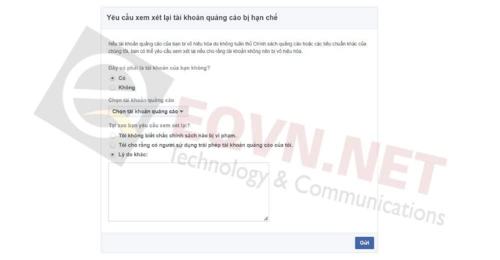 Bước 3: Chọn tài khoản quảng cáo đang bị vô hiệu hóa, rồi điền Lý do tại sao bạn muốn kháng nghị để Facebook xem xét, cuối cùng nhấn “Gửi”.