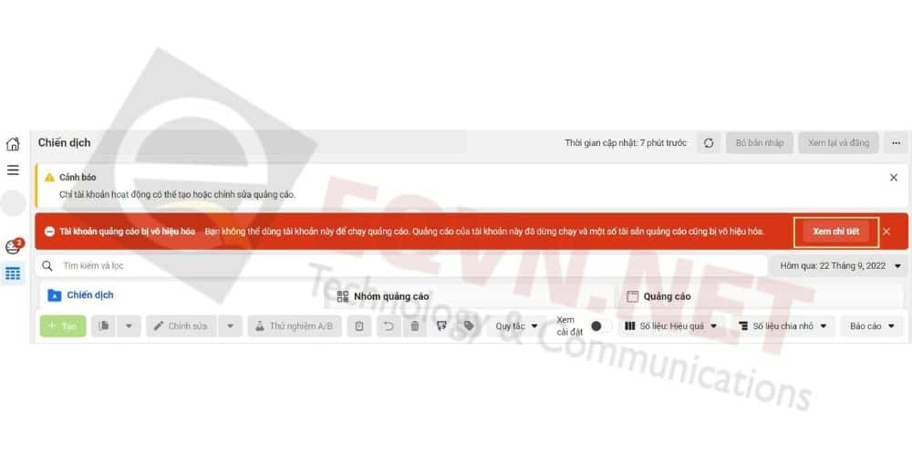 1.2. Tài khoản quảng cáo bị vô hiệu hoá do vi phạm chính sách quảng cáo
