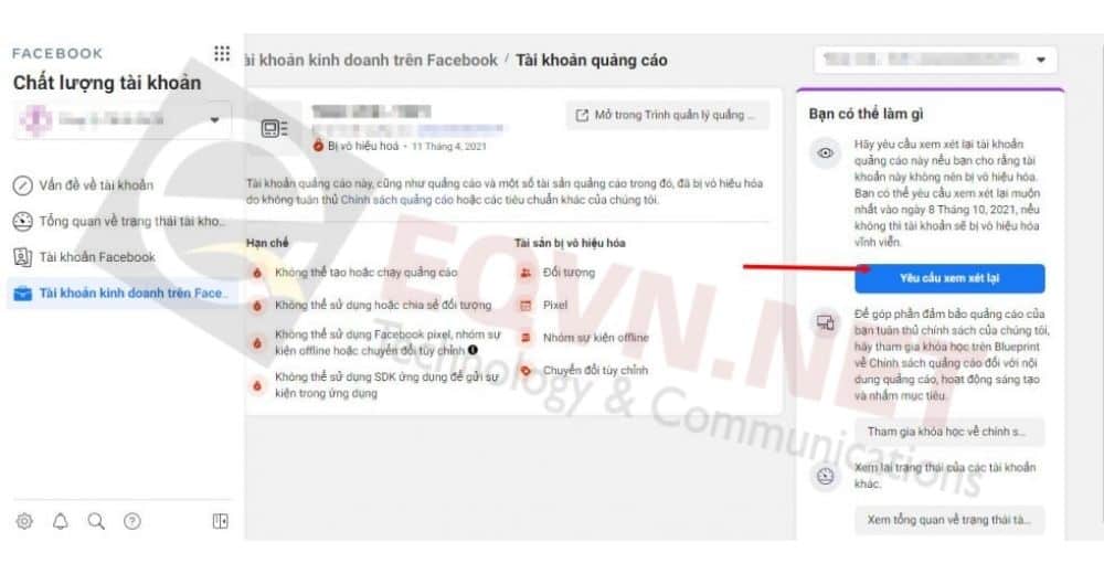 2.2.2. Cách kháng nghị tài khoản quảng cáo Facebook bị vô hiệu hóa không hiển thị “Yêu cầu xem xét”
