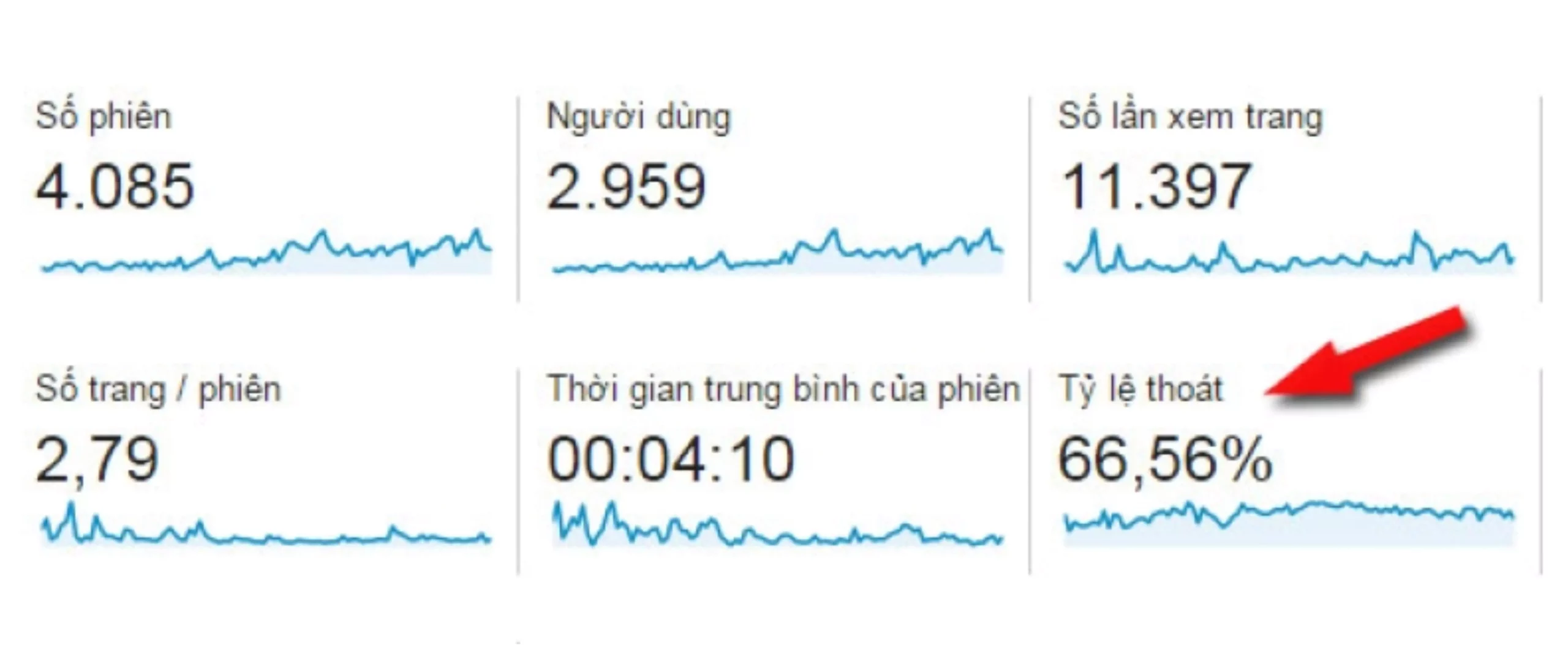 Description: Tỷ lệ phần trăm khách truy cập rời khỏi trang web sau khi chỉ xem một trang. Tỷ lệ thoát trang là một chỉ số quan trọng để đánh giá mức độ hấp dẫn của trang web của bạn. Tỷ lệ thoát trang cao có thể cho thấy rằng khách truy cập không tìm thấy những gì họ đang tìm kiếm hoặc trang web của bạn không thân thiện với người dùng.