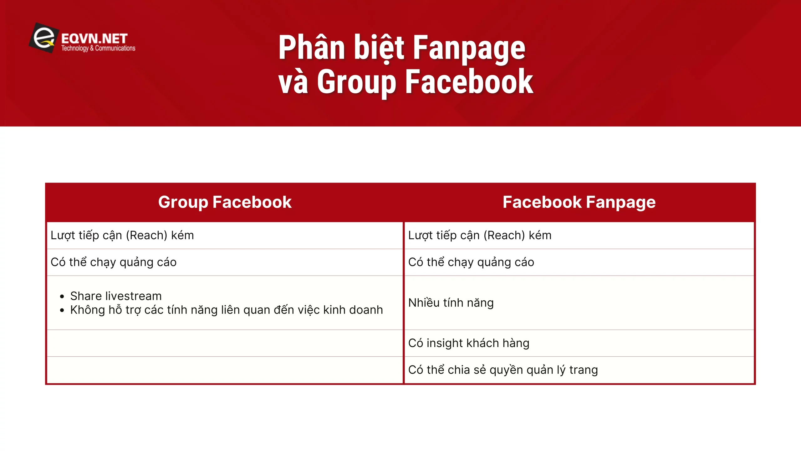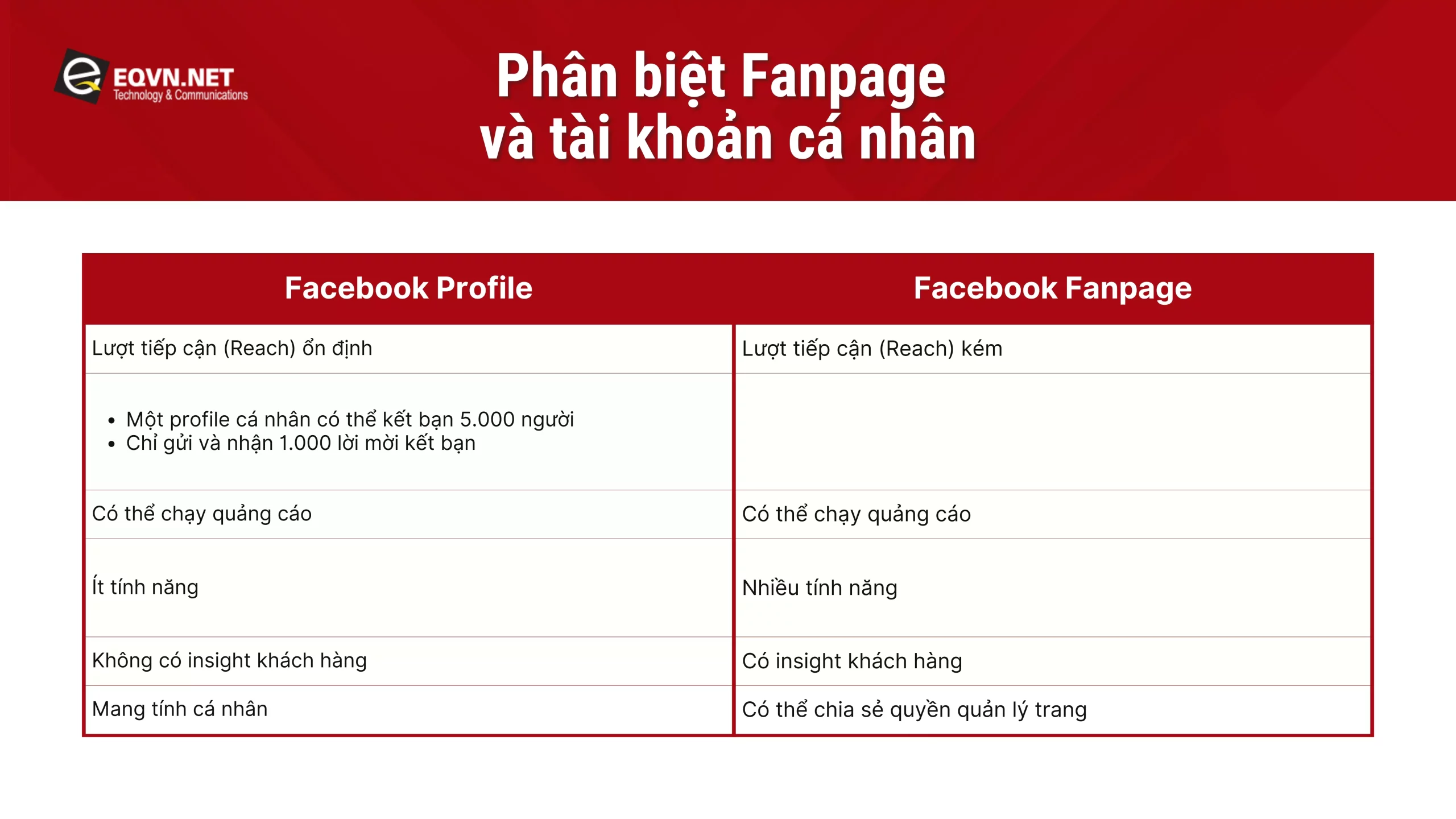 Trong thời đại số, Facebook đã trở thành một phần không thể thiếu trong cuộc sống của hàng tỷ người trên toàn thế giới. Với giao diện thân thiện và tính năng đa dạng, nền tảng này không chỉ là nơi để kết nối bạn bè, chia sẻ khoảnh khắc mà còn là một công cụ marketing hiệu quả cho các doanh nghiệp, giúp học xây dựng thương hiệu, tạo mối quan hệ với khách hàng cũng như thúc đẩy doanh số bán hàng. Với bài viết này, EQVN sẽ giúp bạn hiểu rõ hơn về Fanpage Facebook là gì, những lợi ích của Fanpage và sự khác nhau giữa Fanpage, tài khoản cá nhân và group facebook.