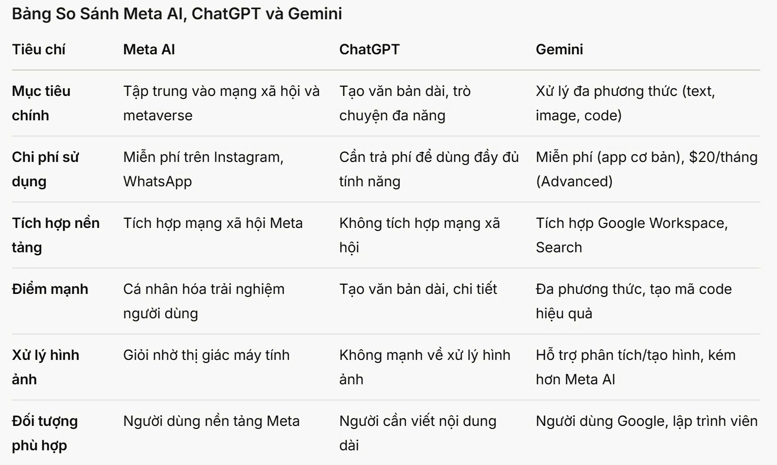 Dưới đây là bảng so sánh giữa Meta AI với ChatGPT và Gemini để bạn dễ hình dung sự khác biệt. Điều này giúp bạn chọn công cụ phù hợp với nhu cầu của mình.