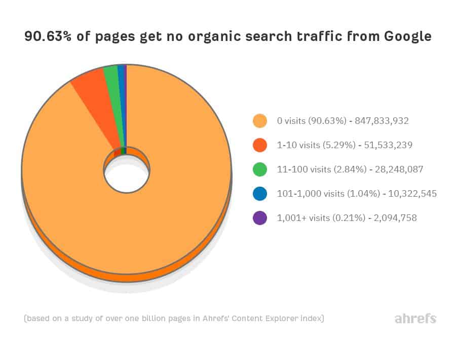 Nghiên cứu từ khóa là cách duy nhất để tìm ra những gì mọi người đang nhập vào công cụ tìm kiếm. Bạn cần biết điều này để tránh tạo nội dung về những thứ mà không ai đang tìm kiếm. Theo một nghiên cứu của Ahrefs, nhiều chủ sở hữu trang web mắc phải sai lầm đó và nó có thể là một phần lớn nguyên nhân khiến 90,63% trang không nhận được lưu lượng truy cập từ Google.