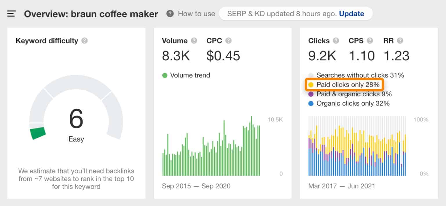 Bạn cũng nên cảnh giác với những từ khóa mà quảng cáo trả tiền “đánh cắp” rất nhiều nhấp chuột. Ví dụ: 28% nhấp chuột cho “máy pha cà phê braun” chuyển đến quảng cáo trả tiền, vì vậy từ khóa đó có thể là mục tiêu tốt hơn cho PPC.