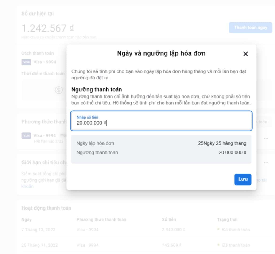 Khi bắt đầu chiến dịch quảng cáo trên Facebook, cách ngưỡng thanh toán hoạt động đóng vai trò quan trọng trong việc quản lý tài chính và đảm bảo tính kiểm soát của chiến lược quảng cáo. Ngưỡng lập hóa đơn mặc định sẽ được thiết lập với một số tiền nhỏ để kiểm tra phương thức thanh toán. Sau khi chi phí quảng cáo đạt đến mức này và thanh toán thành công, số dư sẽ được xóa, tạo điều kiện cho việc quảng cáo tiếp theo.