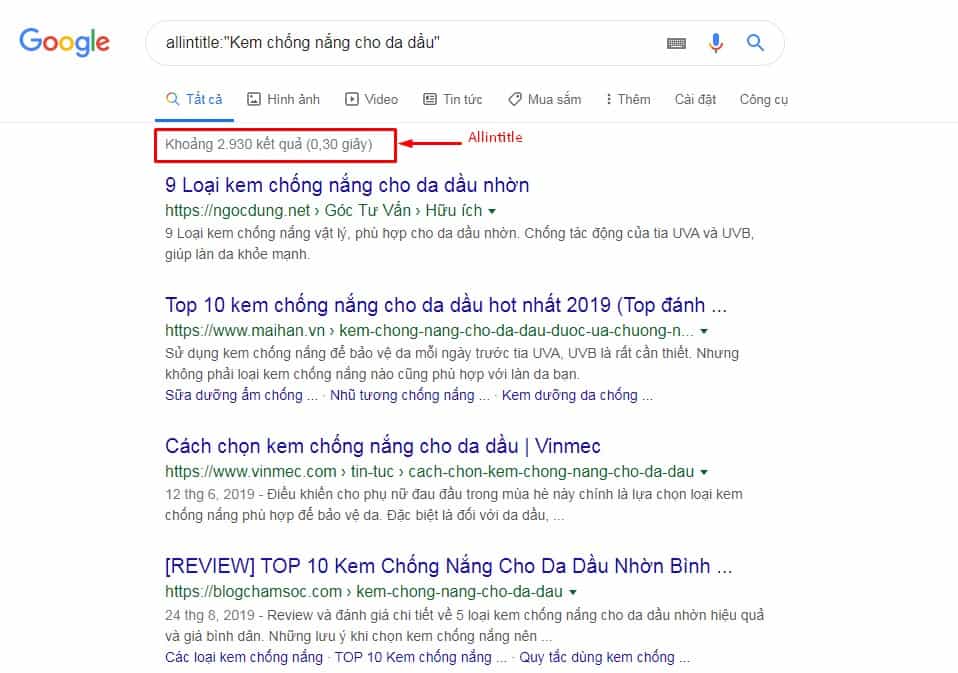 Khi bạn search trên Google cú pháp “allintitle:từ khóa”, ví dụ: “allintitle: kem chống nắng cho da dầu”, nghĩa là bạn đang muốn Google trả kết quả về số lượng bài viết có chứa cụm từ “kem chống nắng cho da dầu” trong tiêu đề.