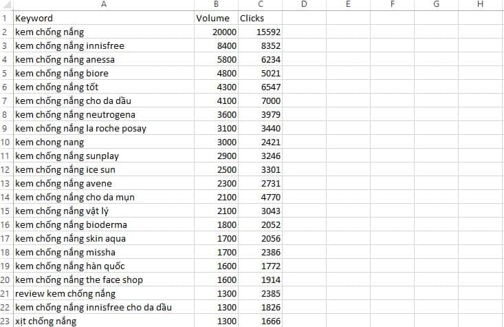 Sau khi xuất file, bạn tiếp tục xóa một số cột không cần thiết chỉ để lại các cột: Keyword, Volume và Clicks.