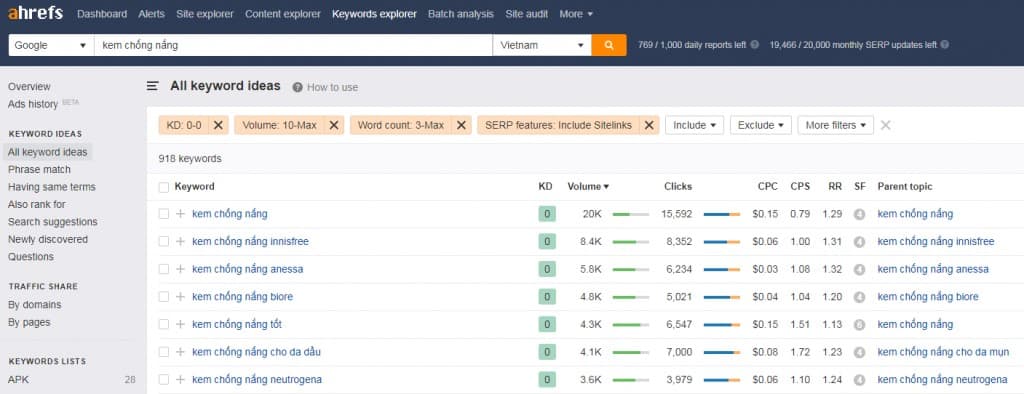 - SERP Features: include Sitelinks (nhằm mục đích lọc những từ khóa có URL lên top)