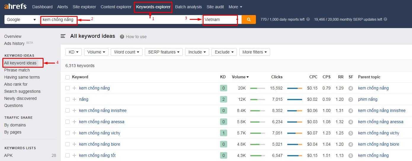 Đầu tiên, bạn truy cập vào Ahrefs, bấm Keyword Explorer, sau đó nhập từ khóa bạn cần tìm kiếm, chọn quốc gia Vietnam, rồi chọn All keyword ideas để xem toàn bộ từ khóa có liên quan.
