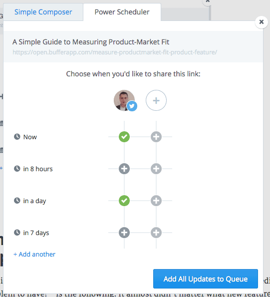 Buffer đã giải thích cách họ thiết kế Power Scheduler và dành nhiều thời gian trước khi đạt được PMF cho tính năng này. Khác với việc áp dụng cho một sản phẩm, Buffer đã áp dụng PMF cho một tính năng, để xây dựng một thứ gì đó có giá trị.