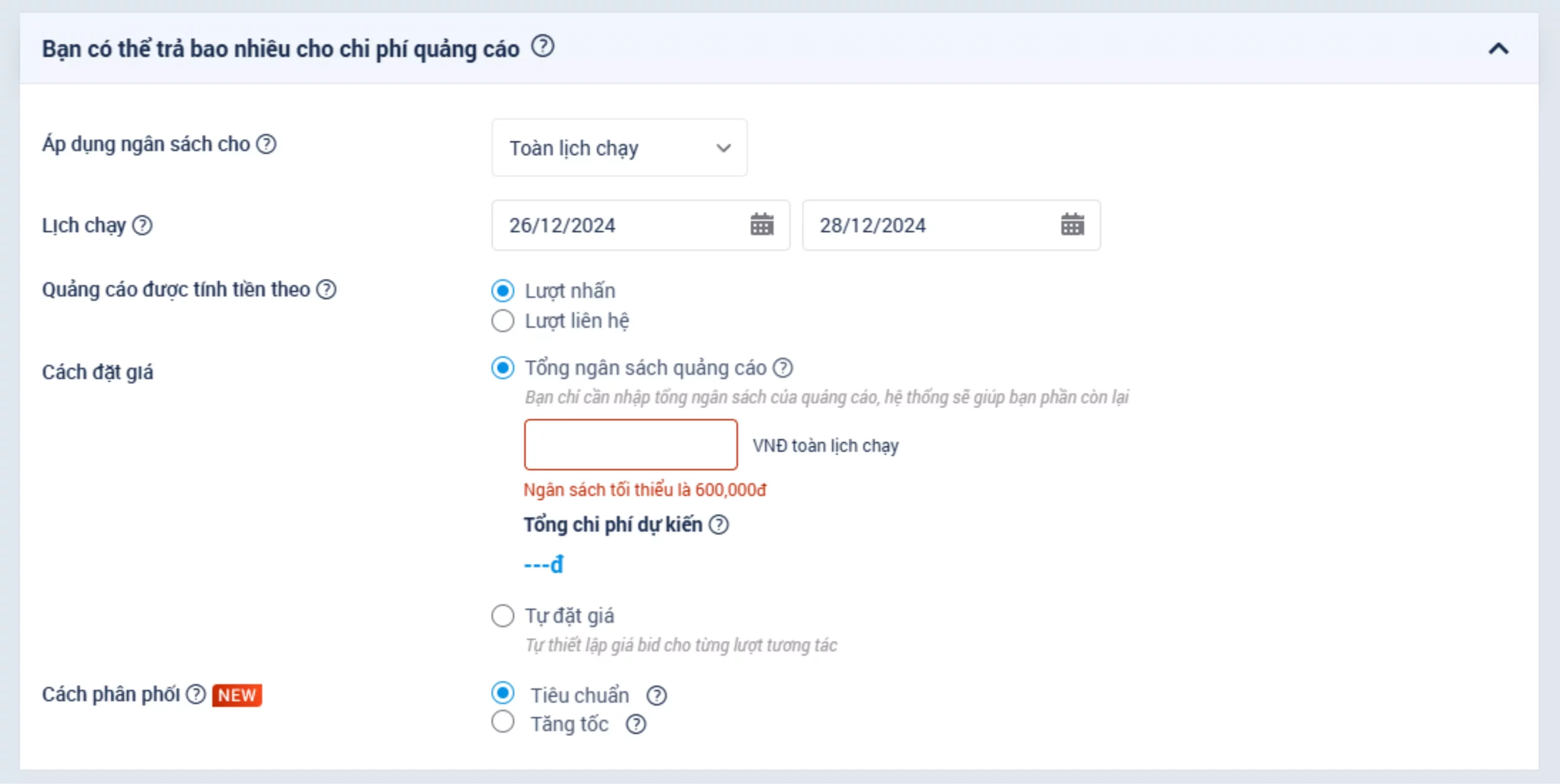 Ở bước này, bạn sẽ cần xác định ngân sách cho quảng cáo của mình. Các quy định về chi phí và lịch quảng cáo bao gồm: