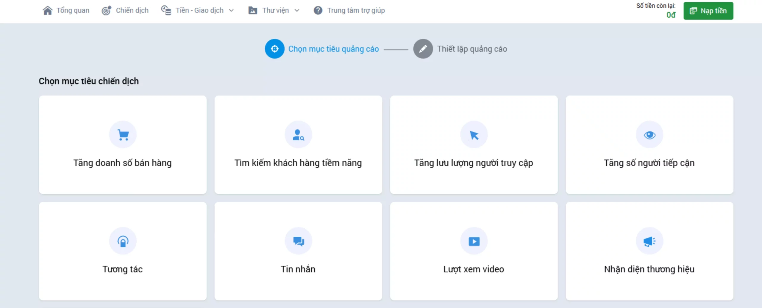 Sau khi đăng nhập, bạn sẽ được chuyển đến giao diện tạo quảng cáo. Tại đây, bạn có thể lựa chọn hình thức quảng cáo phù hợp. Các hình thức có sẵn bao gồm: