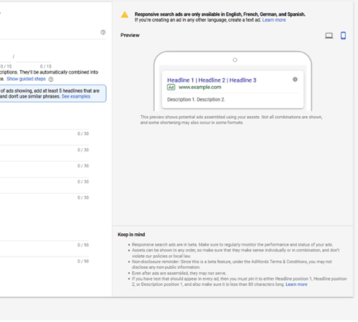 4. Các thông số kỹ thuật của Responsive Search Ads
