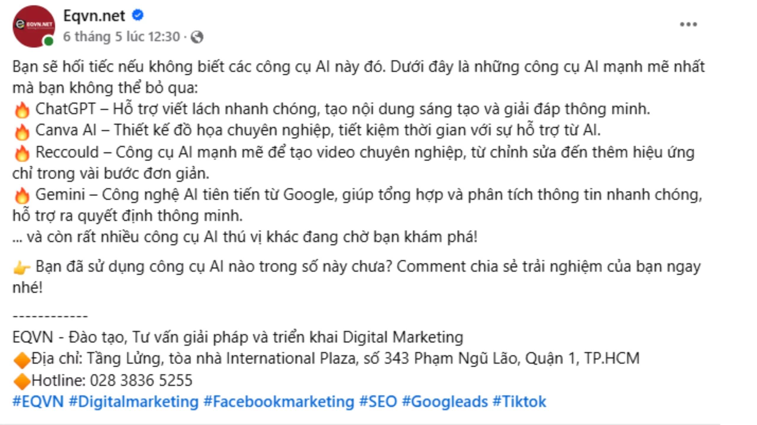 EQVN là đơn vị tiên phong trong lĩnh vực đào tạo khóa học Digital Marketing từ năm 2009 và là đối tác chính thức của Facebook và Google. Với kinh nghiệm hơn 20 năm, chúng tôi sẽ cung cấp cho bạn những kiến thức Digital Marketing mới nhất và hữu ích nhất! Tìm hiểu thêm về EQVN tại đây nhé!