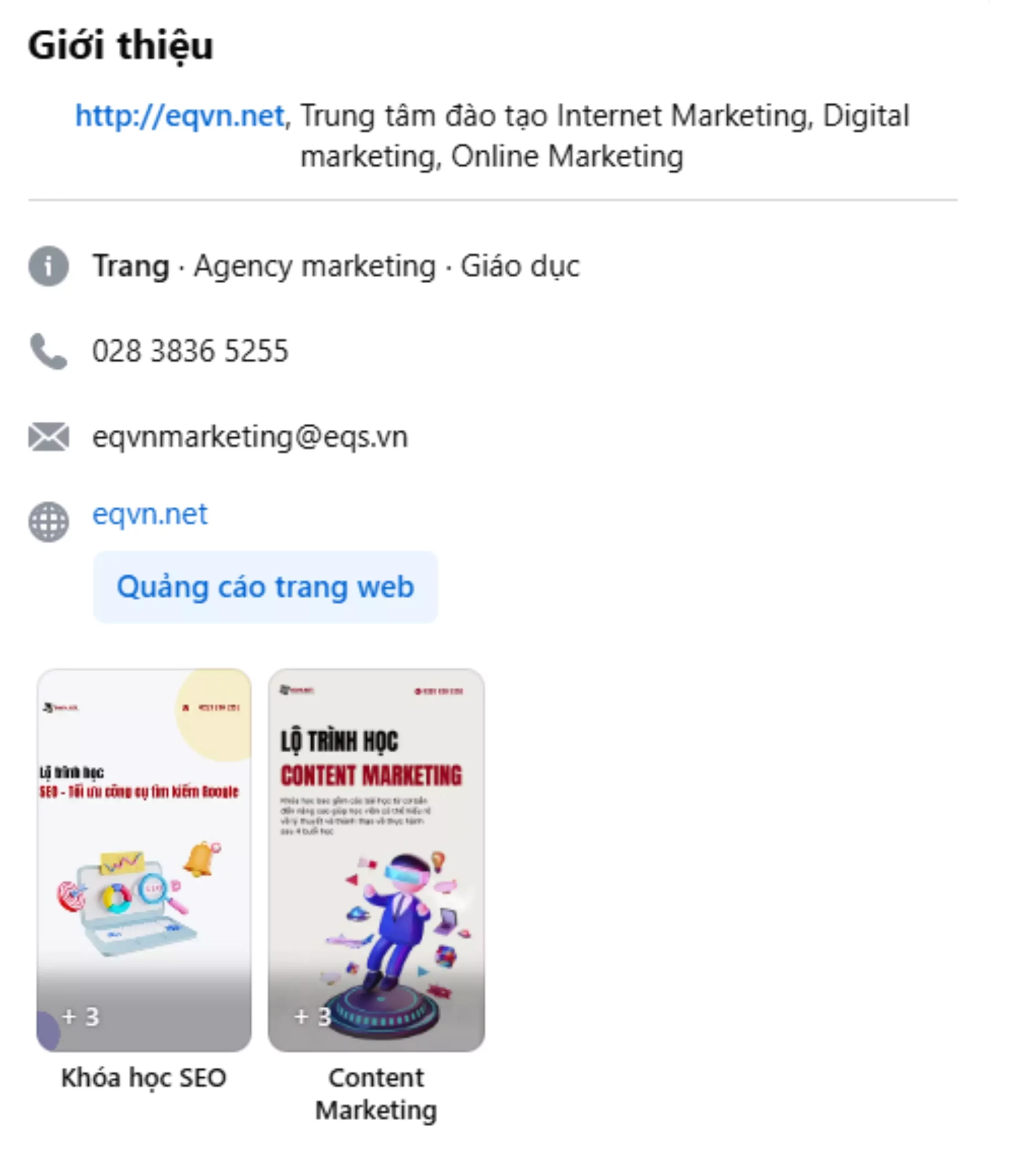 Ngoài ra, nếu muốn tìm hiểu nhiều hơn về các đặc trưng khi hoạt động trên Facebook, bạn cũng có thể tham khảo qua khóa học Facebook Marketing tại EQVN. Với bộ tài liệu được cập nhật mới nhất về toàn bộ các đặc điểm nổi bật khi kinh doanh cho bất kỳ người dùng nào, cũng như cách thức triển khai quảng cáo nhằm tăng độ nhận diện thương hiệu trên nền tảng Facebook