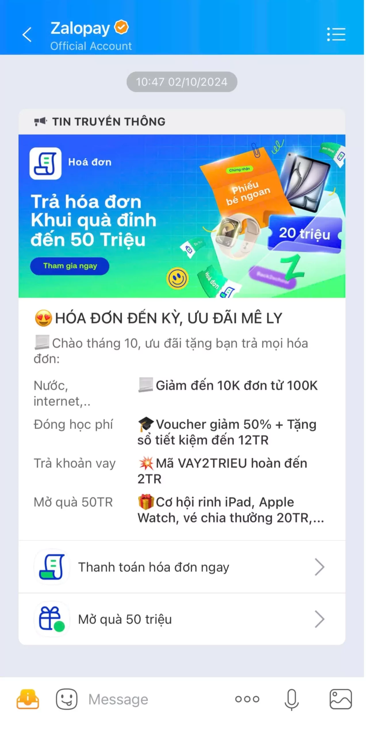 - Người dùng có thể theo dõi Zalo Page để nhận thông tin về sản phẩm, dịch vụ và các chương trình khuyến mãi.