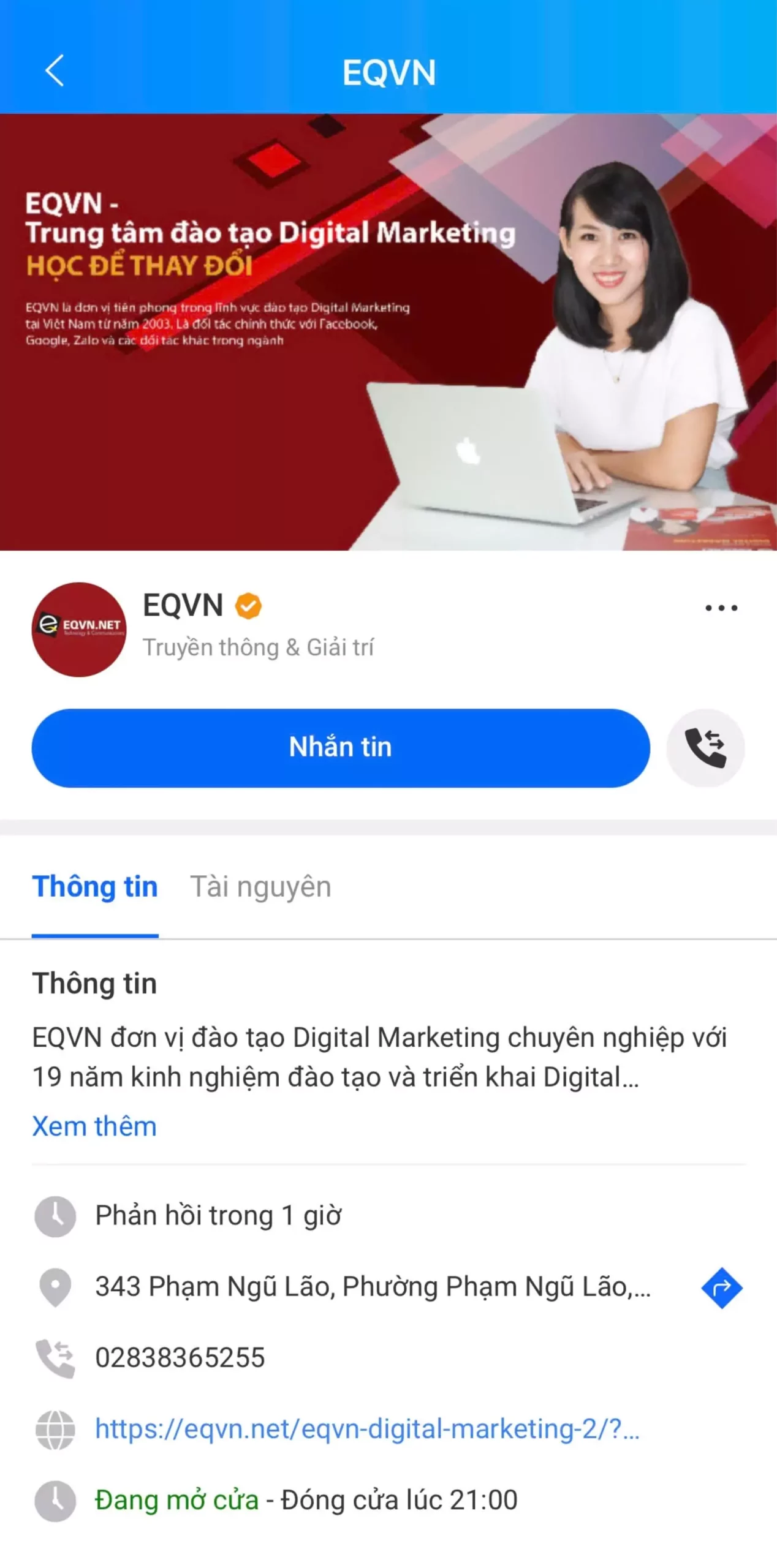 EQVN là đơn vị tiên phong trong lĩnh vực đào tạo khóa học Digital Marketing từ năm 2009 và là đối tác chính thức của Facebook và Google. Với kinh nghiệm hơn 20 năm, chúng tôi sẽ cung cấp cho bạn những kiến thức Digital Marketing mới nhất và hữu ích nhất! Tìm hiểu thêm về EQVN tại đây nhé!
