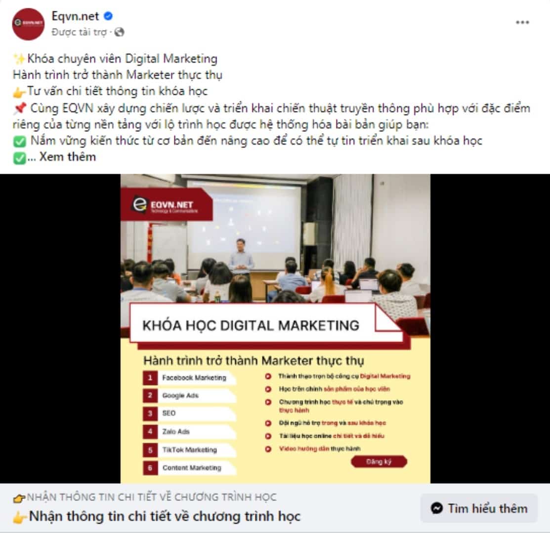 Ngoài ra, nếu muốn tìm hiểu nhiều hơn về các đặc trưng khi hoạt động trên Facebook, bạn cũng có thể tham khảo qua khóa học Facebook Marketing tại EQVN. Với bộ tài liệu được cập nhật mới nhất về toàn bộ các đặc điểm nổi bật khi kinh doanh cho bất kỳ người dùng nào, cũng như cách thức triển khai quảng cáo nhằm tăng độ nhận diện thương hiệu trên nền tảng Facebook