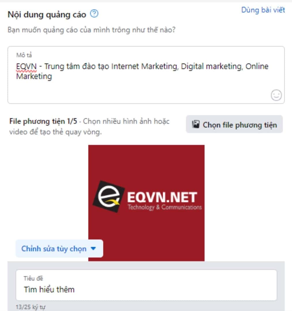 Ở phần này bạn mô tả quảng cáo của mình trông như thế nào qua nội dung quảng cáo và hình ảnh/ video minh họa. Hoặc bạn có thể dùng các bài viết có sẵn trên trang Fanpage để quảng cáo