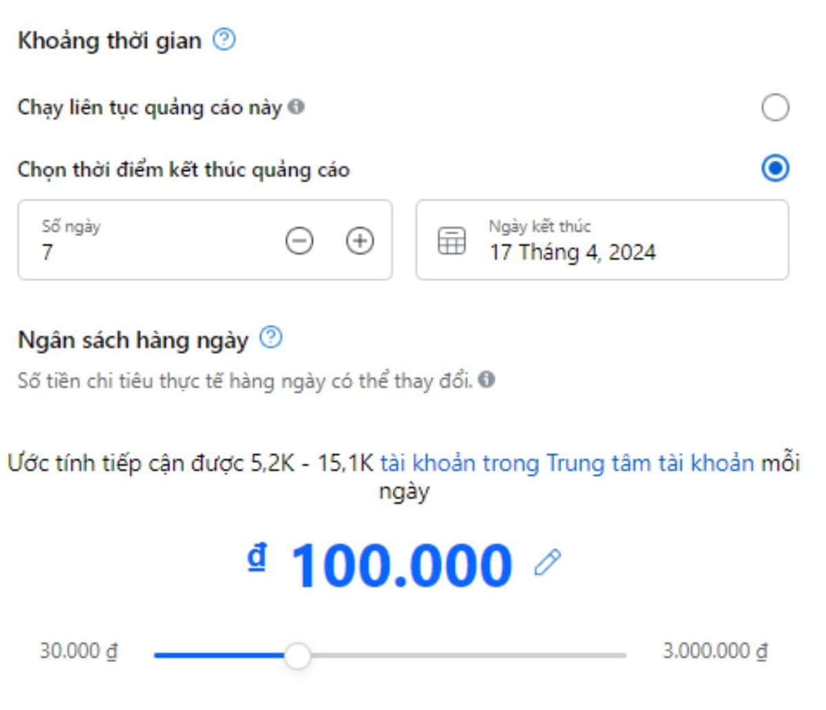 Cần cài đặt khoảng thời gian chạy quảng cáo: Quảng cáo sẽ chạy liên tục trong khoảng thời gian bạn đưa ra.