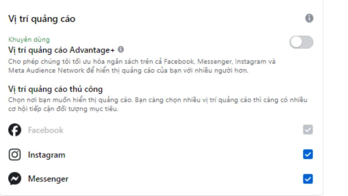Dù là lựa chọn tự động hay thủ công, hãy đảm bảo rằng vị trí được chọn phù hợp với mục tiêu và đối tượng của bạn để tối ưu hóa hiệu quả quảng cáo trên Facebook.
