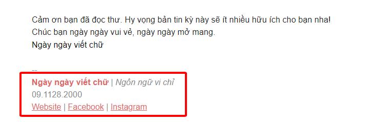 Tuy nhiên, vì là một phần nhỏ để kết thúc email, bạn nên cố gắng kiểm soát các nội dung đưa vào để tránh gây nhiễu lượng thông điệp muốn truyền tải. Và hãy nhớ luôn cập nhật nó để phù hợp với mục tiêu truyền thông của công ty.