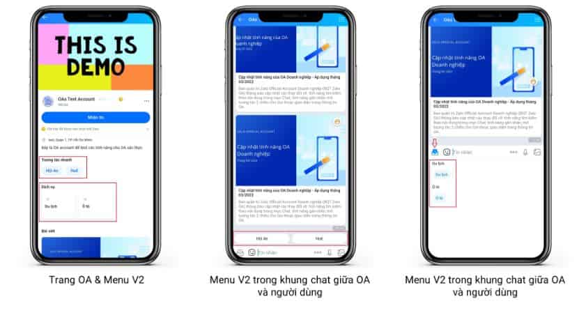 Sau khi được thiết lập, thanh Menu V2 cũng sẽ được hiển thị ở các vị trí giống thanh Menu V1, tuy nhiên giao diện hiển thị sẽ khác trong khung chat giữa người dùng với doanh nghiệp.