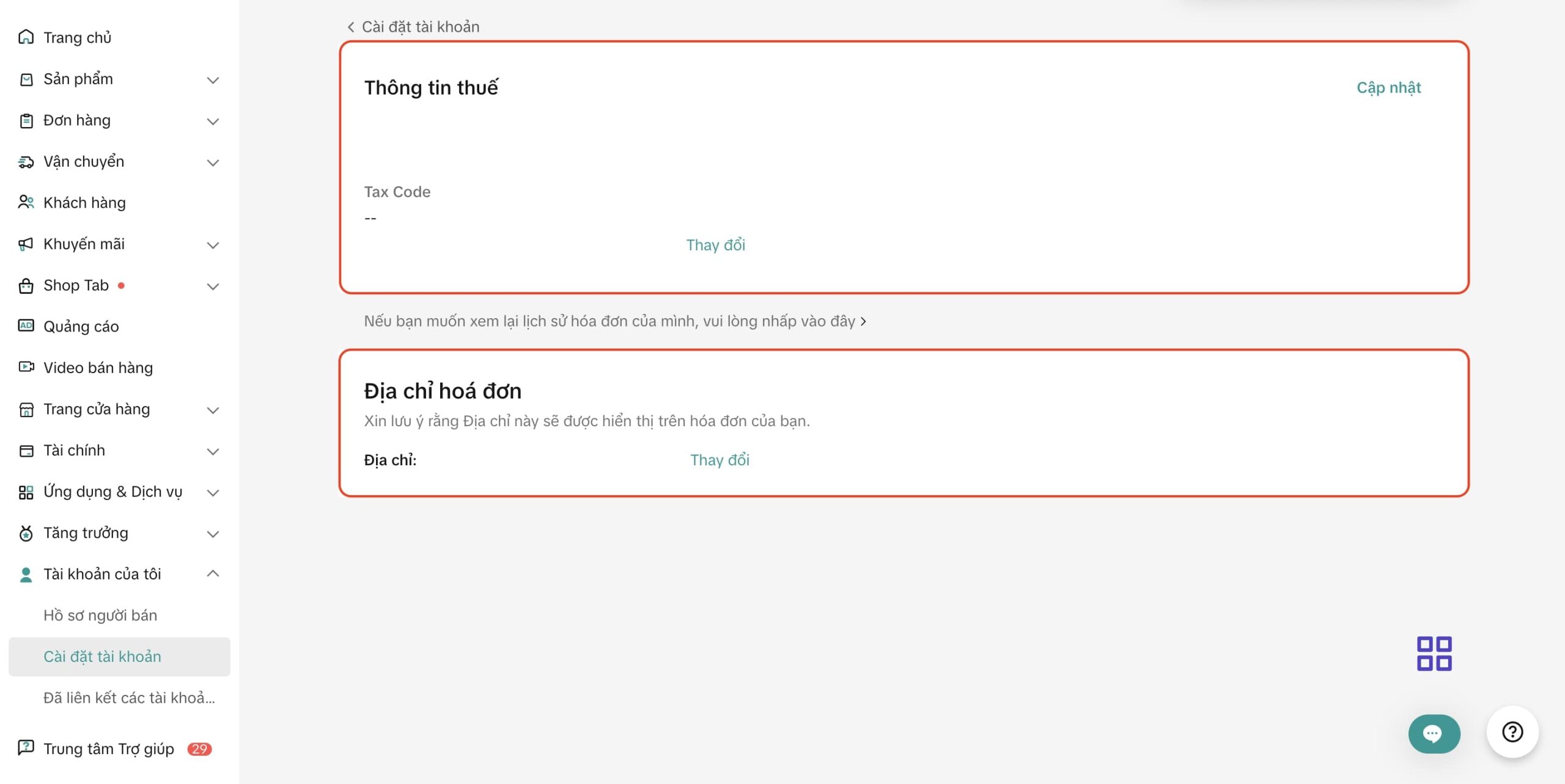 - Truy cập Cài đặt > Thông tin thuế > Nhập Thông tin Thuế (Tax Code) và Địa chỉ hoá đơn