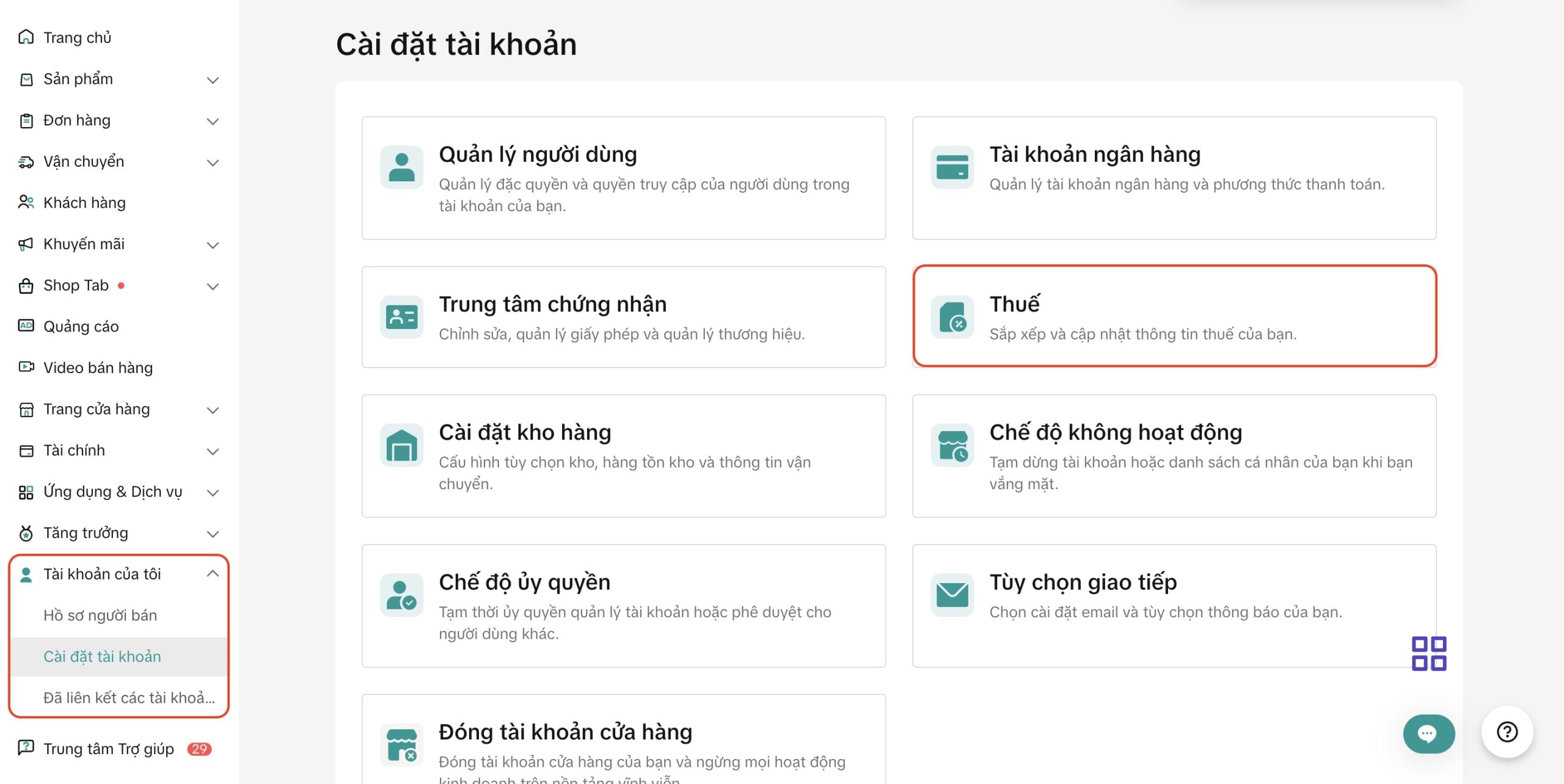 - Vào Cài đặt tài khoản (Account Settings) > Thuế