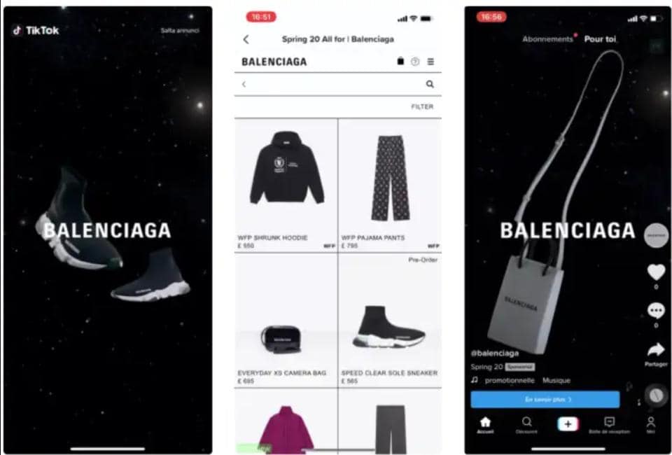Quảng cáo của Balenciaga nhằm thúc đẩy nhận thức và thử nghiệm với các phương tiện truyền thông mới trên TikTok, để tiếp cận nhiều khán giả ở Pháp và Vương quốc Anh. Kết quả nhận được tổng cộng hơn 25 triệu lượt xem video, tỷ lệ tương tác của người dùng cũng cao hơn mức trung bình, cho thấy một lượng khán giả mới của người dùng TikTok đã kết nối với Balenciaga ở tài khoản cá nhân. Sau đó, họ tiếp tục khám phá chi tiết hơn về lĩnh vực thời trang sang trọng này, với hơn 4,5 triệu lần nhấp đến trang đích.