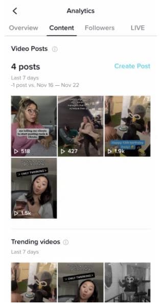 TikTok Analytics cung cấp những thông tin rõ ràng về nội dung video mà bạn đã đăng tải lên tài khoản của mình, bao gồm những video hiệu quả nhất về mặt lượt xem và tương tác. Nhờ tính năng này, bạn sẽ hiểu rõ và có thể phân tích sâu hơn về hiệu suất nội dung các video trên tài khoản của bạn.