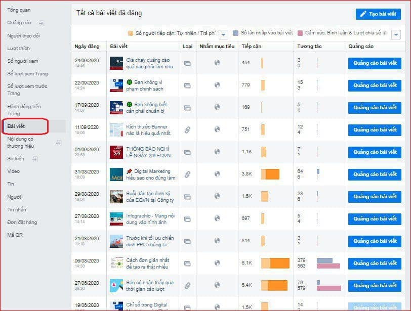 Dưới đây là tất cả các bài đăng đã xuất bản của bạn theo thứ tự gần nhất, cũng như các chỉ số chính của chúng. Chúng không chỉ hiển thị kết quả tương tác mà còn cho bạn thấy các bài viết nào có nhiều tương tác nhất.