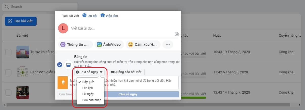 Ở góc trên bên phải, hãy nhấp vào mũi tên sẽ có các lựa chọn khác nhau như trên hình. Bạn có thể quan sát “Tỷ lệ tương tác” của các bài viết.