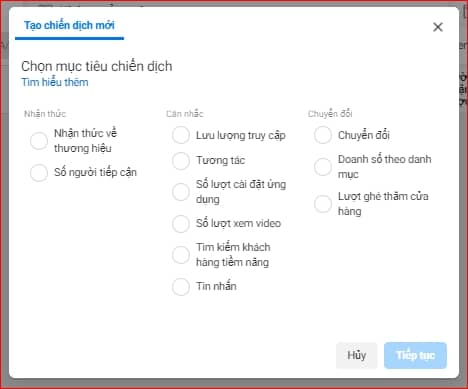 Để tạo quảng cáo, bạn cần nhấn vào nút “Tạo”. Facebook cung cấp cho chúng ta 11 mục tiêu chính để lựa chọn, chia thành ba loại: Nhận thức, Cân nhắc và Chuyển đổi.