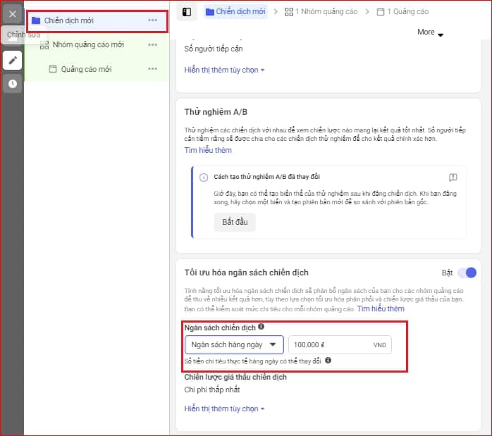 Ngoài ra, Trong Tab “Chiến dịch mới” bạn có thể lựa chọn “Tối ưu hóa ngân sách chiến dịch” theo 02 cách: