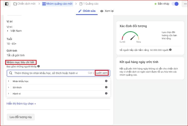 Nếu không, hãy tạo mới bằng cách chọn thông tin nhân khẩu học cho đối tượng như vị trí, độ tuổi, giới tính và kể cả ngôn ngữ.