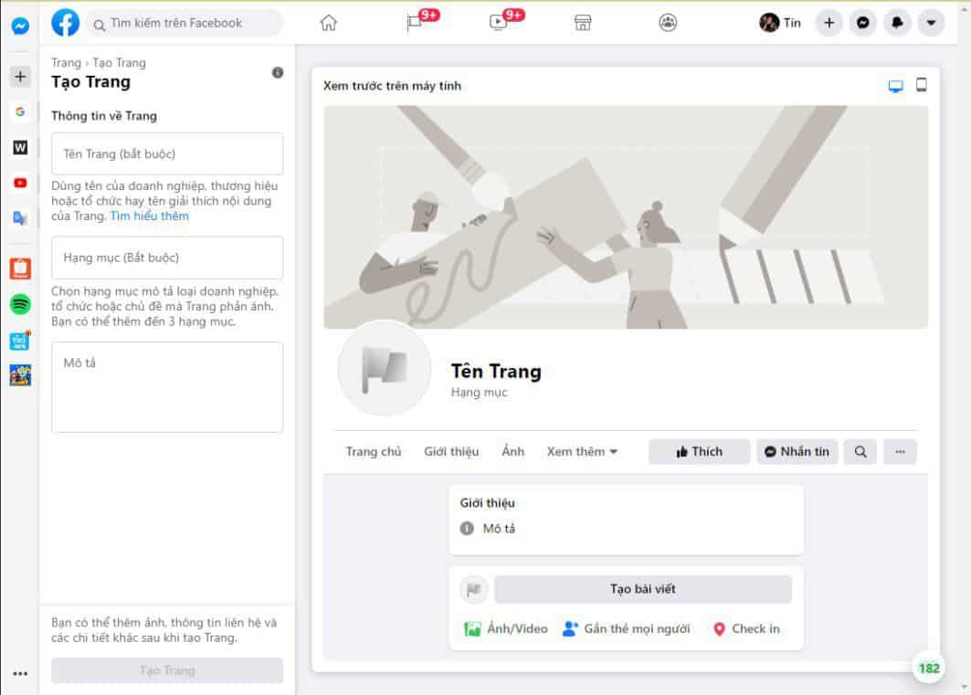 Nhấn “Tạo Trang”. Bước tiếp theo là đăng tải hình ảnh “Đại diện” và “Ảnh bìa”.