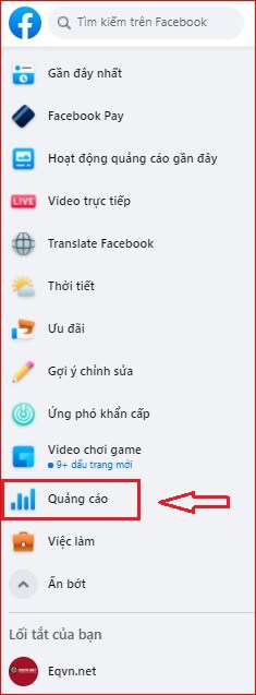 Khi bạn tạo quảng cáo Facebook, Trình quản lý quảng cáo (Ad manager) sẽ là nơi bạn phải truy cập. Để tìm Trình quản lý quảng cáo từ Facebook, hãy truy cập trang chủ Facebook của bạn và tìm “Quảng cáo” từ menu bên trái.