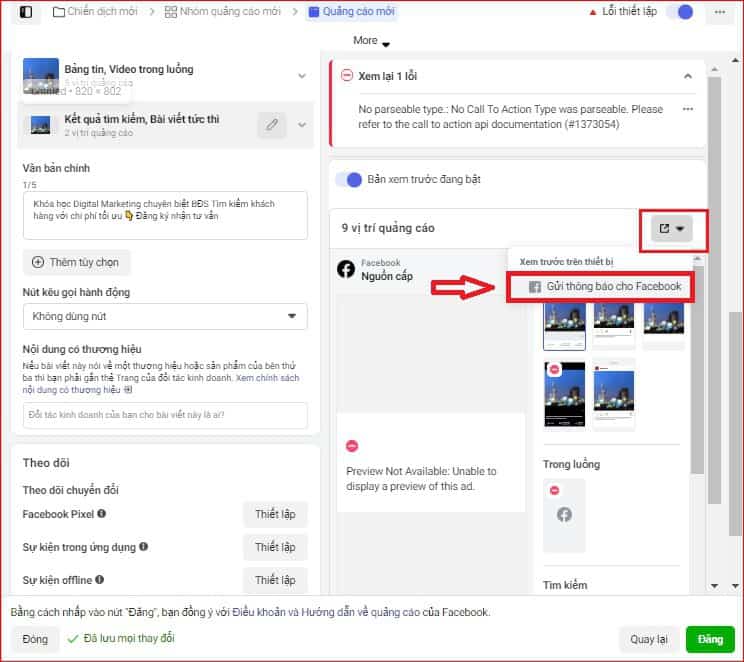 Cuối cùng, bạn có thể xem trước bản hoàn chỉnh quảng cáo của mình bằng cách nhấn vào “Gửi thông báo cho Facebook”, đừng lo chỉ mỗi bạn mới có thể xem bản xem trước này. Sau khi được Facebook xét duyệt quảng cáo, bài viết mới thực sự đến tay người dùng.