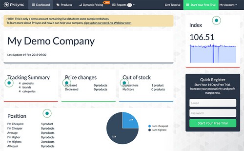 Prisync theo dõi giá của đối thủ cạnh tranh và chứng khoán có sẵn tự động và báo cáo điều này trong bảng điều khiển web hoặc thông báo qua Email. Điều này có nghĩa là bạn không còn phải liên tục kiểm tra thủ công các trang web đối thủ của bạn.