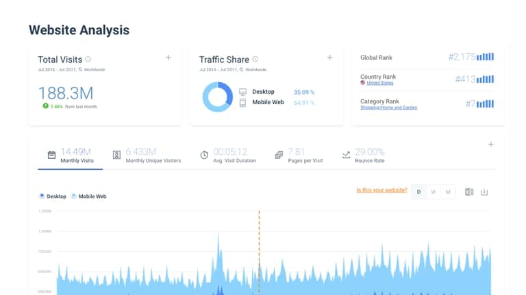 Cung cấp tổng quan về lưu lượng truy cập Website, độ liên quan, lưu lượng tìm kiếm và từ khóa, phương tiện truyền thông xã hội (Social media), quảng cáo hiển thị, đối tượng khách hàng, các trang Web và ứng dụng tương tự.