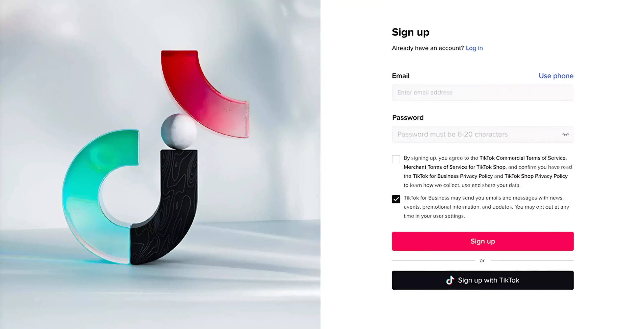 - Tạo thông tin đăng nhập bằng địa chỉ email hoặc số điện thoại và đặt mật khẩu. Đây là thông tin xác thực đăng nhập của bạn để truy cập vào tài khoản Trình quản lý quảng cáo TikTok.