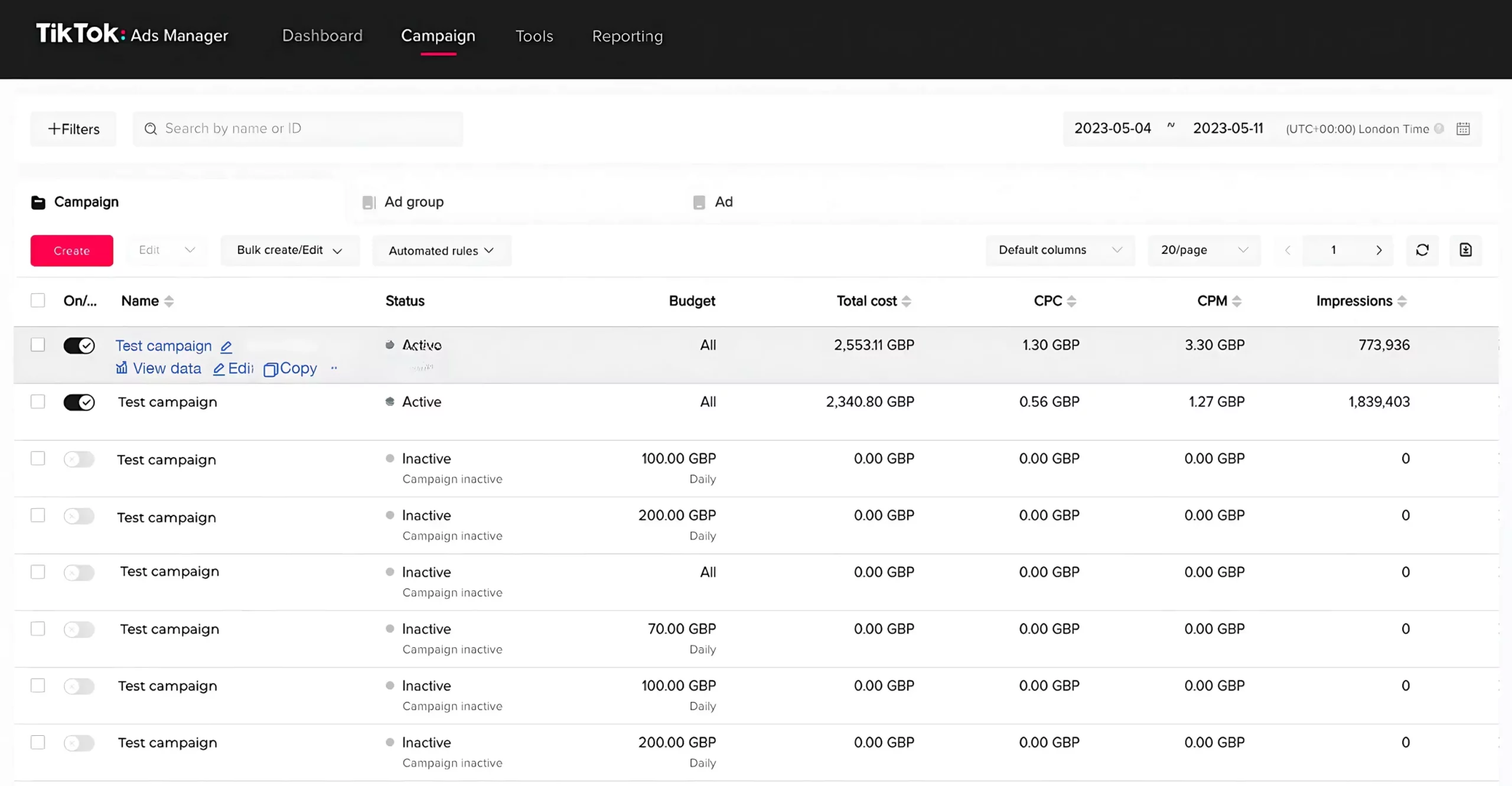 Sau khi chiến dịch được khởi chạy, việc theo dõi và tối ưu quảng cáo TikTok là vô cùng quan trọng để đảm bảo chiến dịch đạt được hiệu quả tối đa. Trong Trình quản lý quảng cáo TikTok, bạn có thể theo dõi các chỉ số chính như Số lượt hiển thị, Số lượt nhấp chuột, Tỷ lệ chuyển đổi…