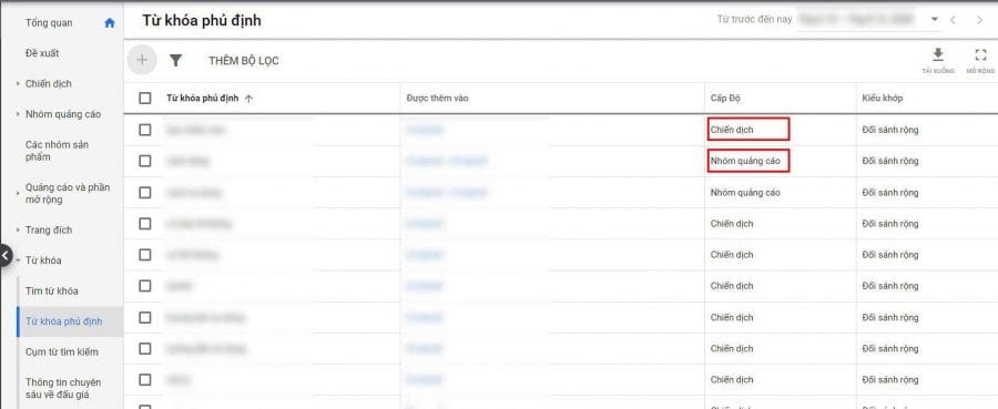 3.1. Từ khoá phủ định cấp chiến dịch