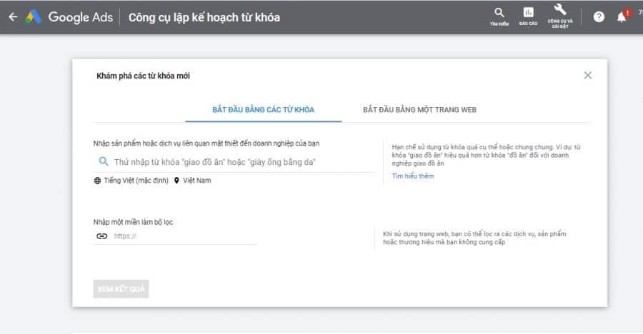 Trên thanh menu, chọn Công cụ và cài đặt, trong mục Lập kế hoạch, chọn Công cụ lập kế hoạch từ khóa (Google Keyword Planner), tiếp tục chọn Khám phá các từ khóa mới để hệ thống đưa ra các gợi ý về từ khóa dài có liên quan, bao gồm cả từ khóa chính và từ khóa phủ định để bạn có thể sàng lọc các ý tưởng tốt nhất cho quảng cáo của mình.