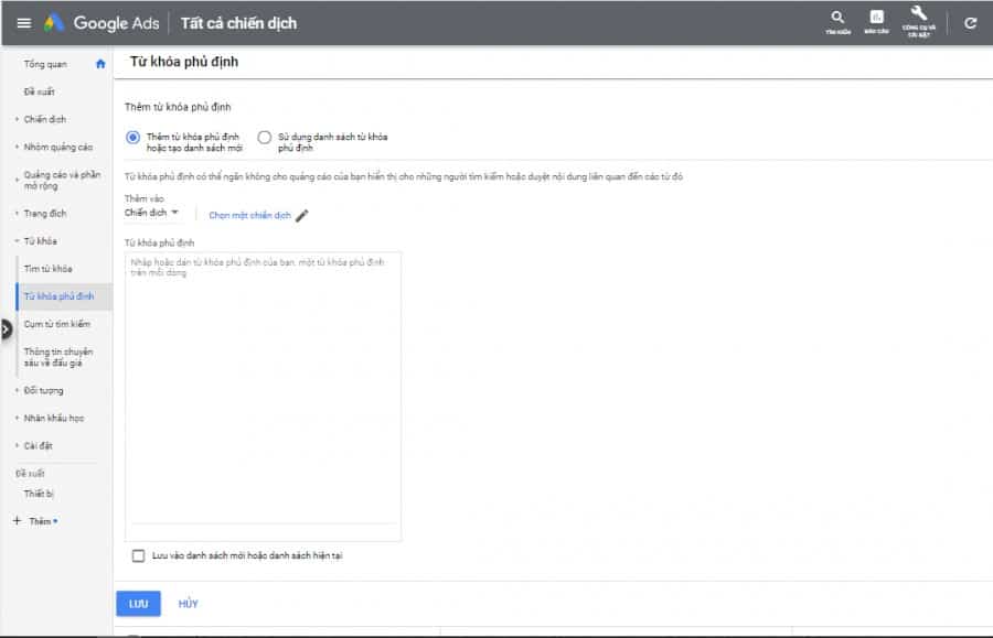 - Lựa chọn thêm từ khóa phủ định vào cấp chiến dịch hay cấp nhóm quảng cáo.
