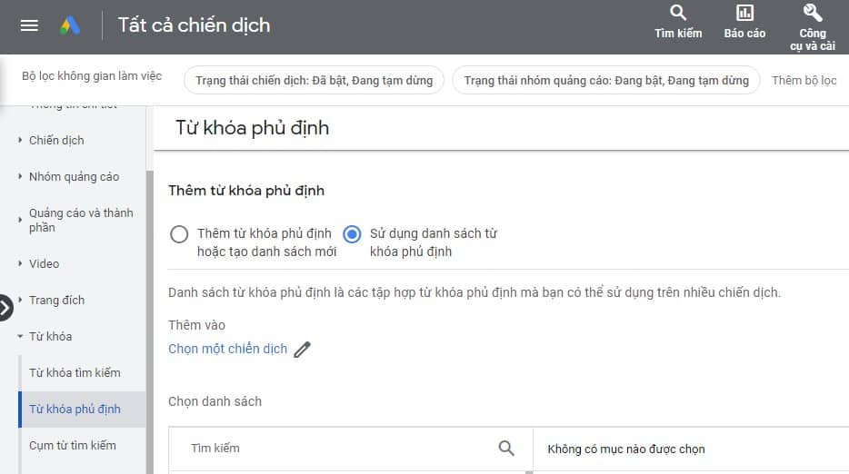 Bước 5: Chọn chiến dịch bạn muốn áp dụng danh sách từ khóa phủ định.